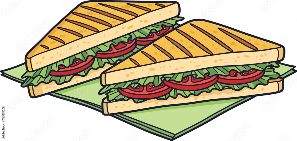 Two Grilled Sandwiches Served on Napkin Ready to Eat at Lunch: Delicious toasted sandwiches with fresh lettuce, tomatoes, on green napkin background for healthy eating concept, ideal food illustration #1765254208