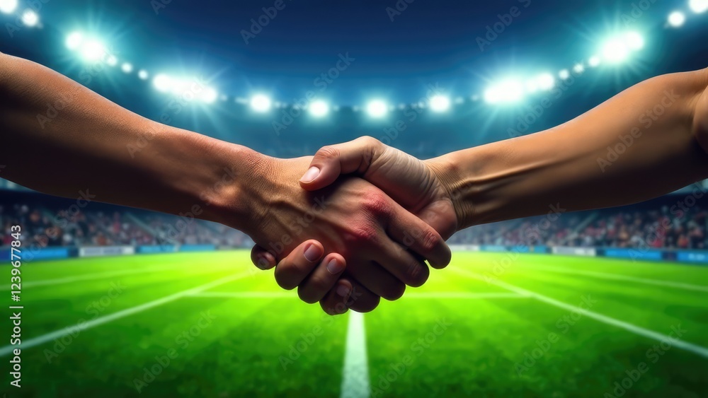 Two hands shaking against a blurred stadium background, representing sportsmanship and agreement. Concept of collaboration. Fair play concept #1239677843