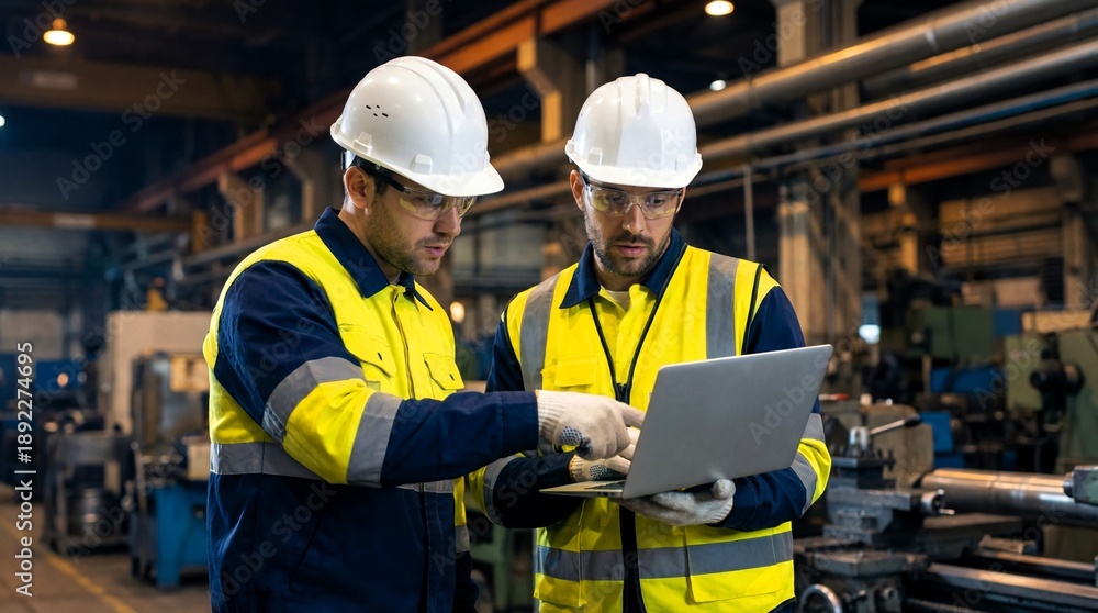 Two industrial engineers in protective gear collaborate reviewing data on a modern laptop computer #1892274695