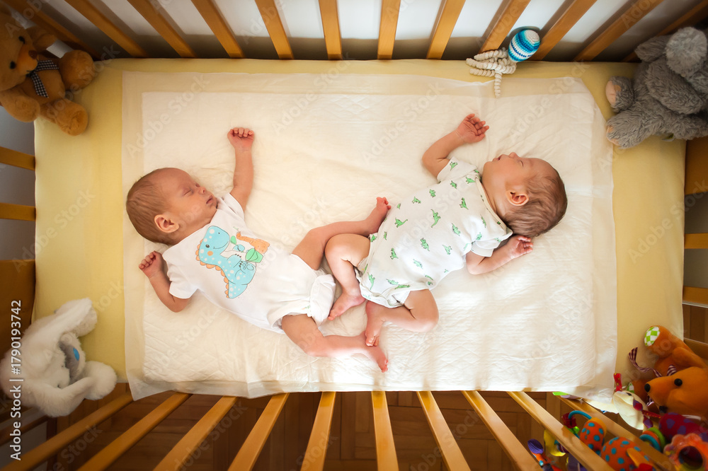 Two infants are lying side-by-side asleep in a crib. Stuffed animal toys surround the crib and a baby mobile hangs above. The infants are wearing dinosaur themed pajamas. #1790193742