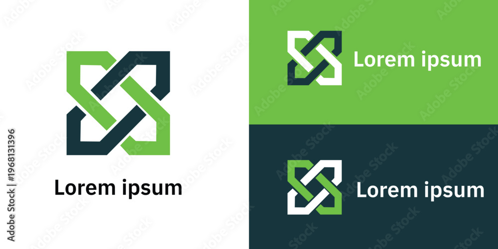Two interlocking arrow link abstract logo variations with placeholder text on green and navy backgrounds, vector illustration concept for tech branding, app icons and digital marketing materials #1968131396