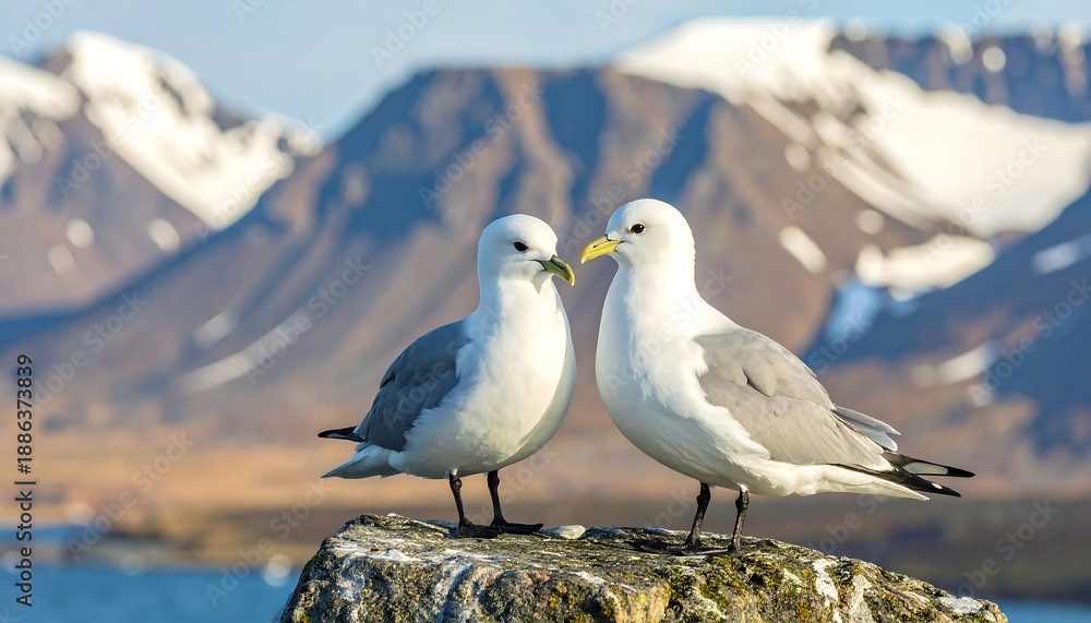 Two Kittiwakes Perched on a Rock with Snowy Mountains. #1886373839