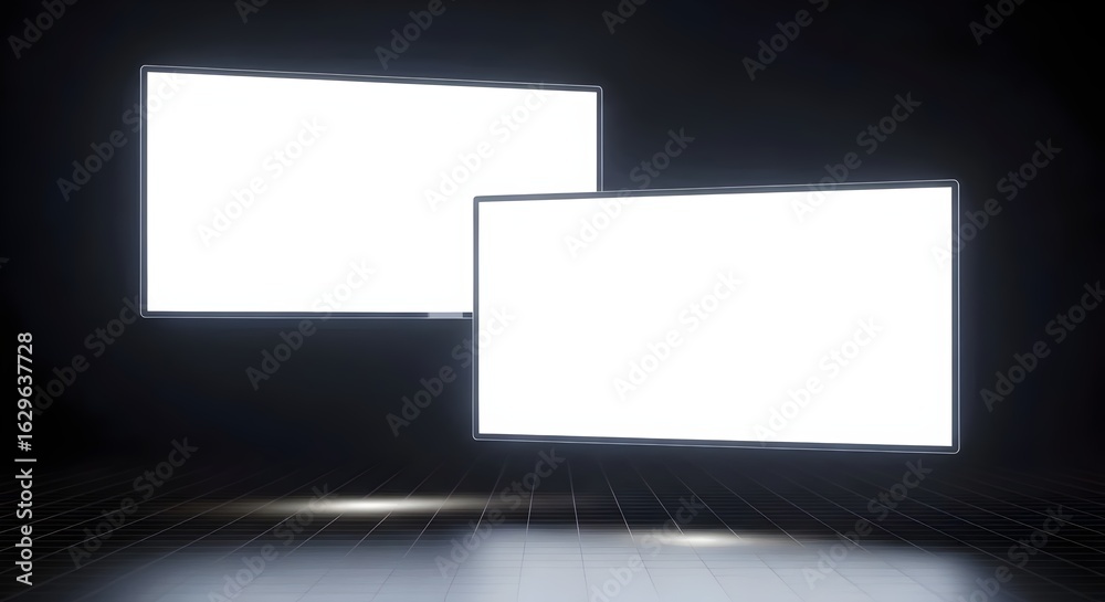 Two large floating rectangular digital screens, computer monitors, with content areas, hovering in a surreal, minimal virtual space.. control room, holographic, modern, wireframe, reflection, floating #1629637728