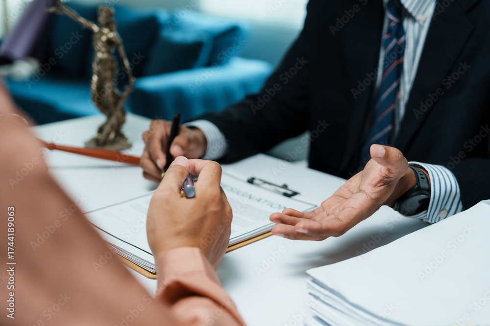 Two lawyers are discussing contract terms and conditions during a meeting in their office, with legal documents and a statue of Lady Justice visible on the table #1744189063