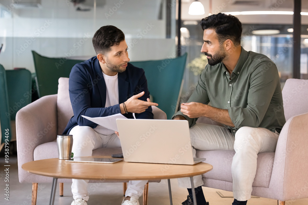 Two male colleagues collaborate on task in office lounge, discussing documents or project updates, planning strategy, explaining ideas or solutions during business meeting. Consultation, negotiations #1958799406