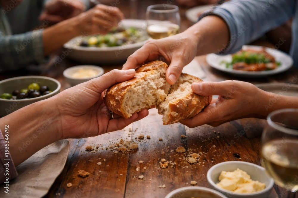 Two pairs of hands are breaking a fresh loaf of rustic bread over a wooden table, emphasizing sharing and togetherness during a casual meal with food and wine #1935346792
