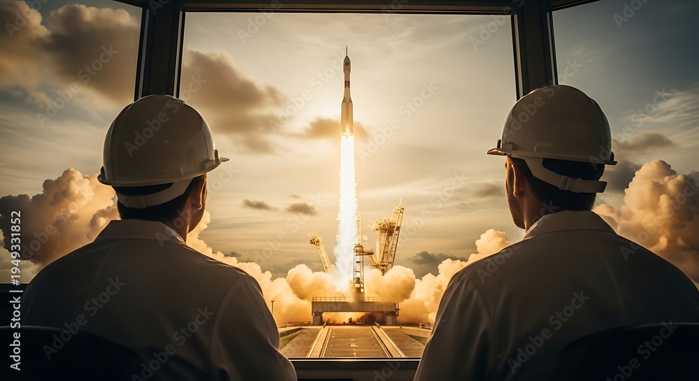 Two people in lab coats watch a rocket launch through a large window #1949331852