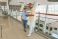 Two people walk and look at a device inside a modern building in the afternoon light #1944400766