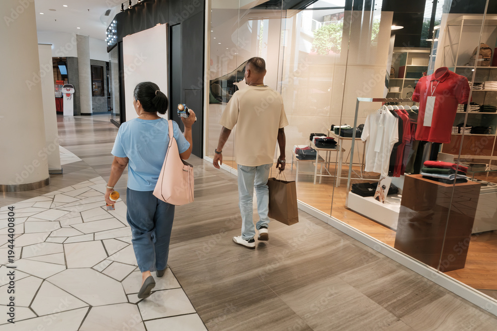 Two people walk past a store in a shopping mall carrying items during the day in a busy retail space #1944400804