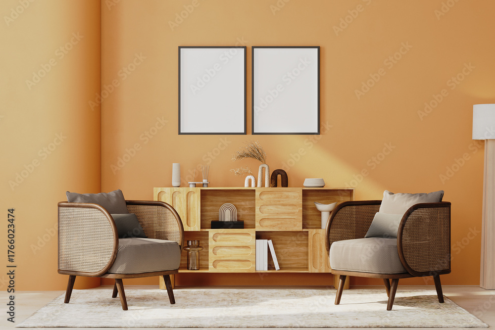 two poster frames mock-up in bright orange wall interior, living room with armchairs and cabinets, wall mock-up, 3d render #1766023474