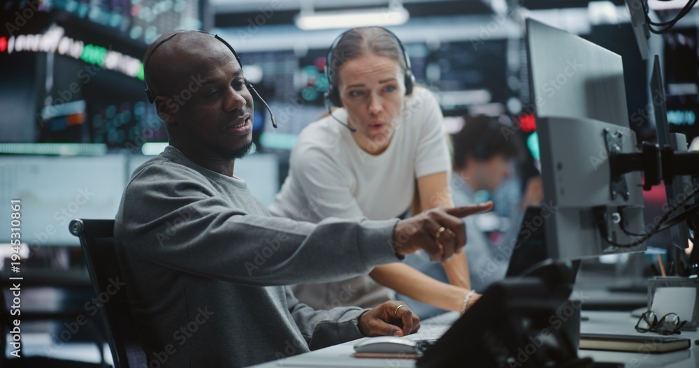 Two Professional Brokers Analyzing Big Data Trends on Multi Monitor Dashboard. Man Gestures Towards Specific Chart on Monitors While Woman Provides Input. Strategic Planning in Modern Fintech Office. #1945310861