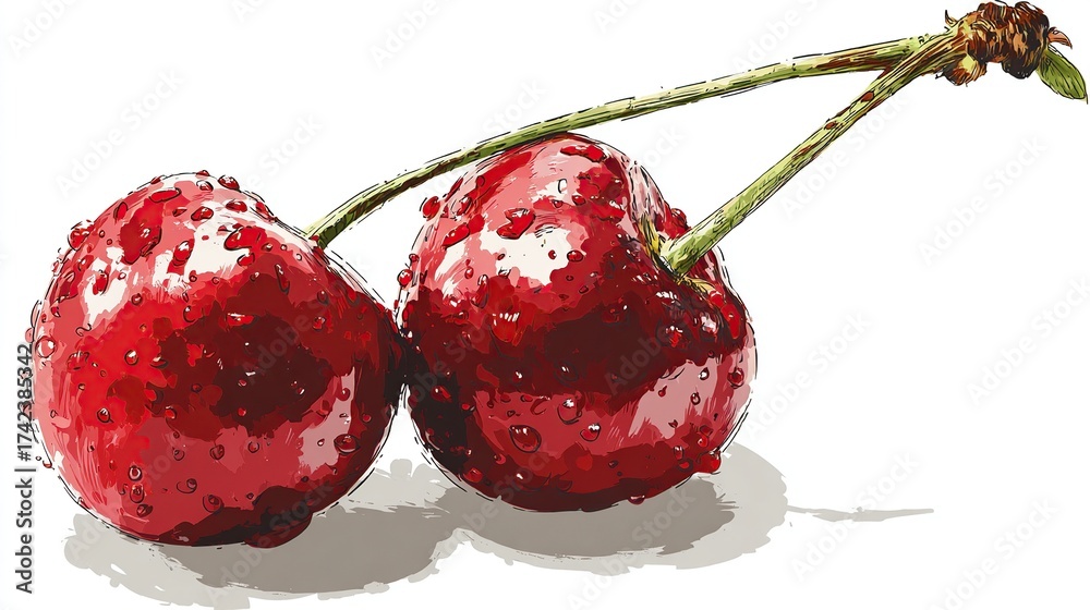 Two ripe, red fruit with water droplets on them connected by a green stem, white backdrop #1742385342