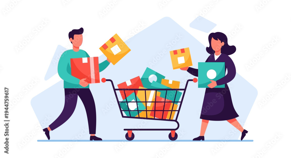 Two shoppers push a colorful grocery cart in a lively urban street scene. #1944759617
