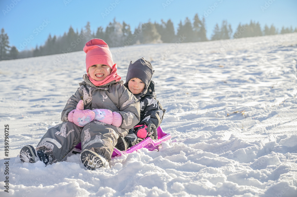 Two siblings experience the joy of winter together as they ride a sled down a snowy hill, creating lasting memories filled with excitement and happiness #1959790725