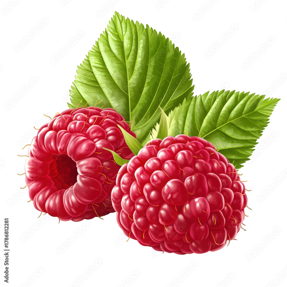 Two vibrant raspberries with fresh green leaves isolated on transparent background, showcasing the fruits juicy texture and natural sweetness for healthy eating #1786812281