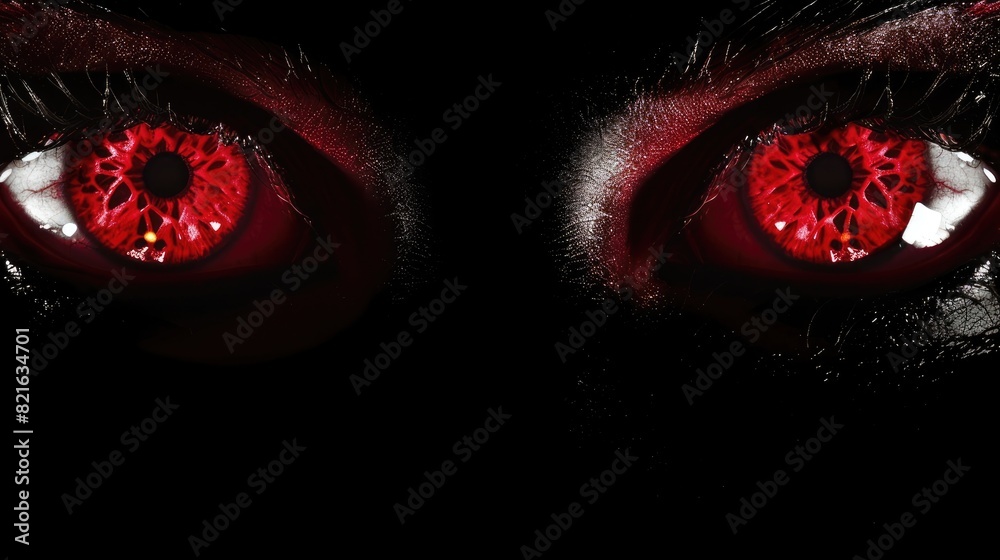two vibrant red female devil eyes staring directly at the viewer on a black background. Created using: minimalist style, strong visual impact of the red on black, gothic or modern font for the text, d #821634701
