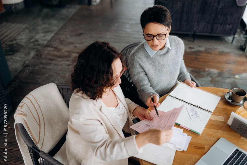 Two women are engaged in a lively discussion as they review important documents at a charming cafe. Notes and coffee surround them, creating an inspiring work atmosphere. #1972095220