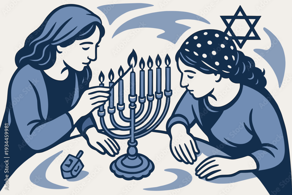 Two women celebrating Hanukkah by lighting the menorah together at a table #1934459981