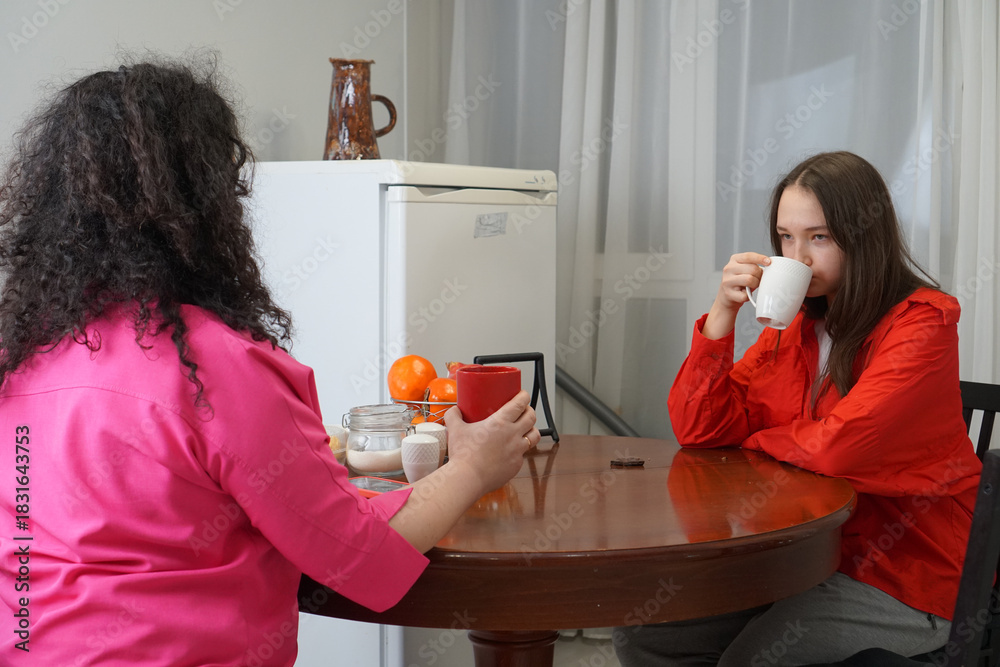 Two women in colorful shirts having a conversation while drinking tea at home. #1831643753
