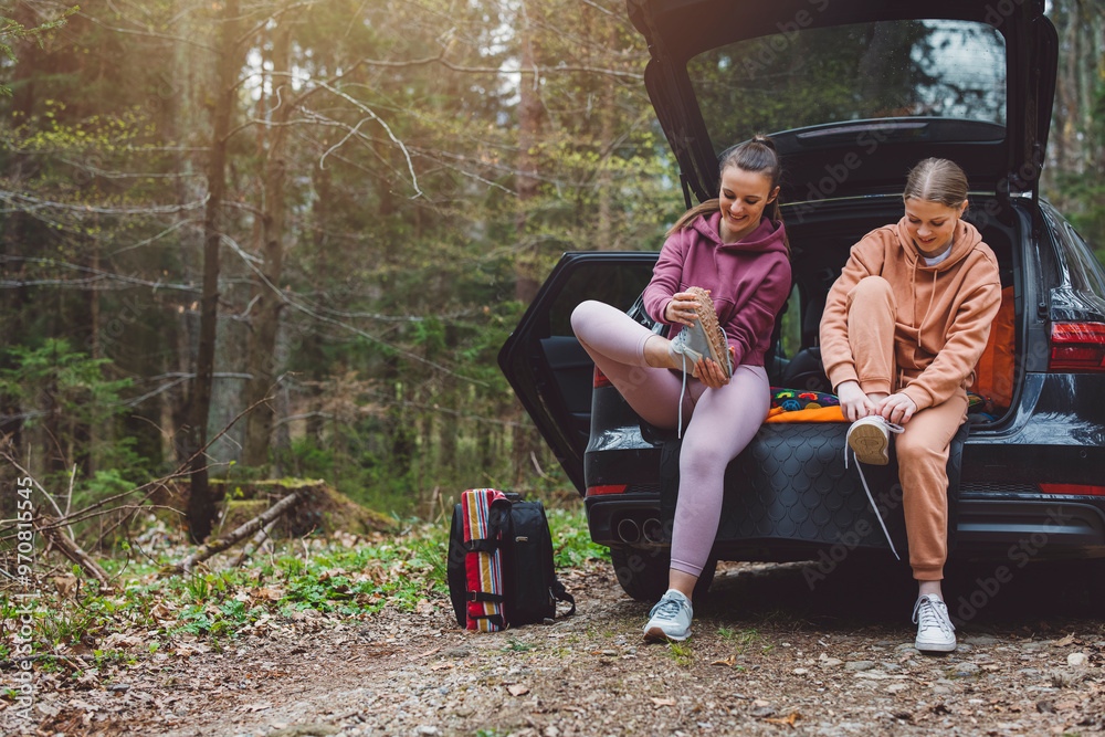 Two women sitting on the back of a car in a forest, tying their shoelaces. They are dressed in casual athletic wear, surrounded by nature with trees and a backpack nearby. #970815545