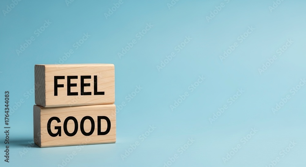 Two wooden blocks stacked with the words feel good on a light blue background #1764344083