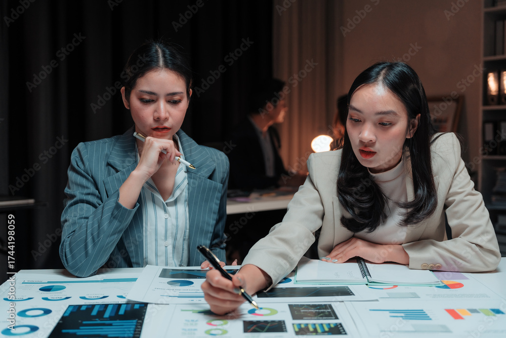 Two young businesswomen examining financial data on charts and graphs, working late in a dimly lit office #1744198059