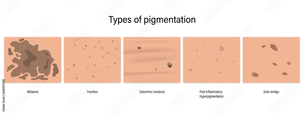 Types of pigmentation vector. Melasma, Freckles, Seborrheic keratosis, Post Inflammatory Hyperpigmentation and Solar lentigo. #668475408