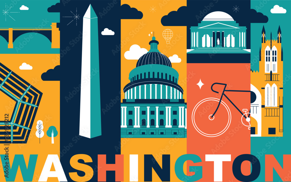 Typography word Washington branding technology concept. Collection of flat vector web icons. Culture travel set, famous architectures, specialties silhouette. USA famous landmark split video screen #534929212