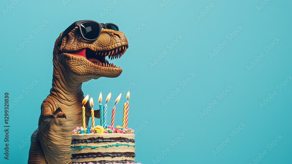 Tyrannosaurs Rex (T Rex) dinosaur wearing sunglasses, sitting by a birthday cake. Happy birthday party graphic banner with copyspace #1299321830