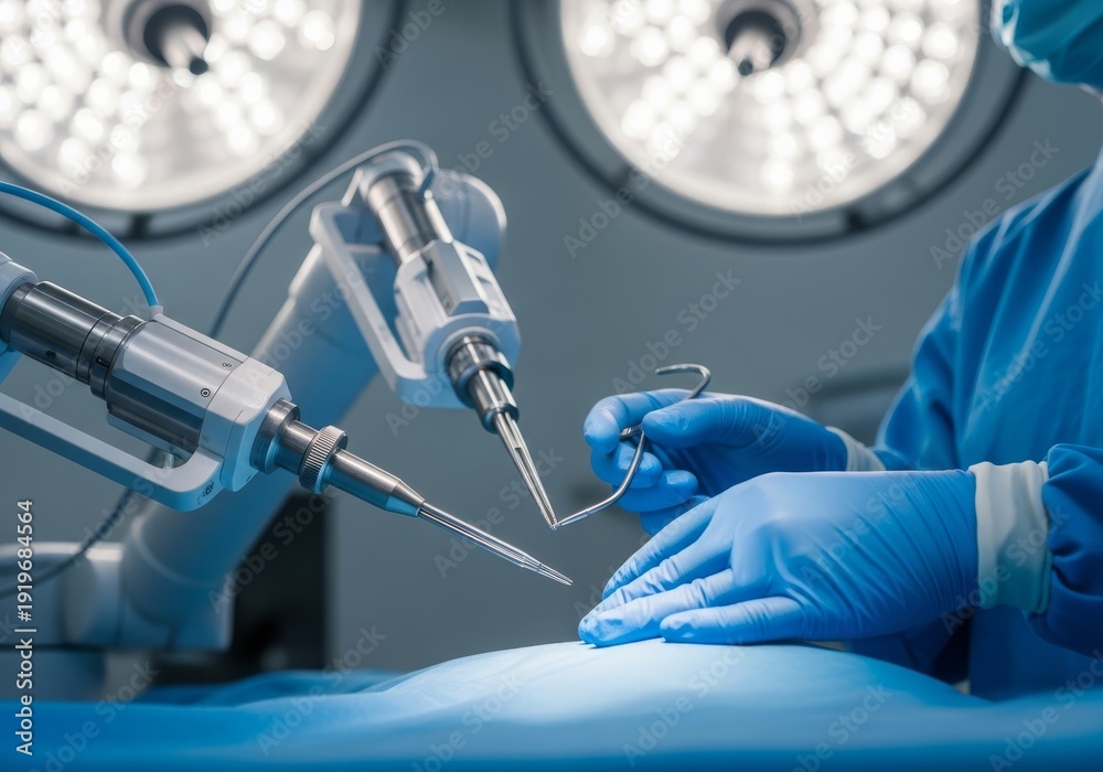 Ultra realistic view of a robotic microsurgery arm collaborating precisely with a human surgeon's hand under cinematic theater lighting, modern, metallic, collaboration #1919684564
