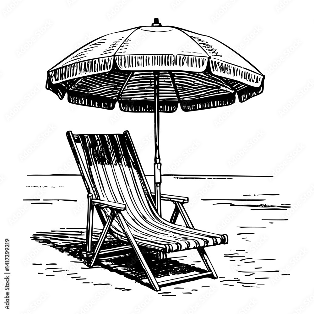Umbrella and seat on beach sketch engraving black and white outline. Scratch board imitation. illustrated in vintage line art style on a white background. #1417299219