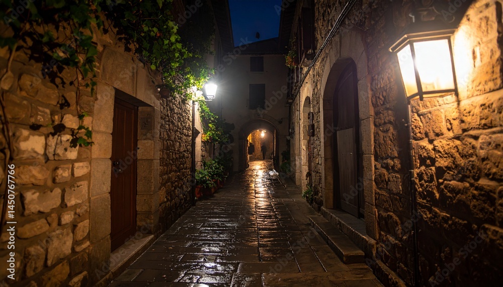 Un callejón tenuemente iluminado, con senderos empedrados que brillan por la lluvia reciente. El parpadeo de los faroles proyecta una cálida luz sobre los antiguos muros de piedra adornados con hiedra #1450767766