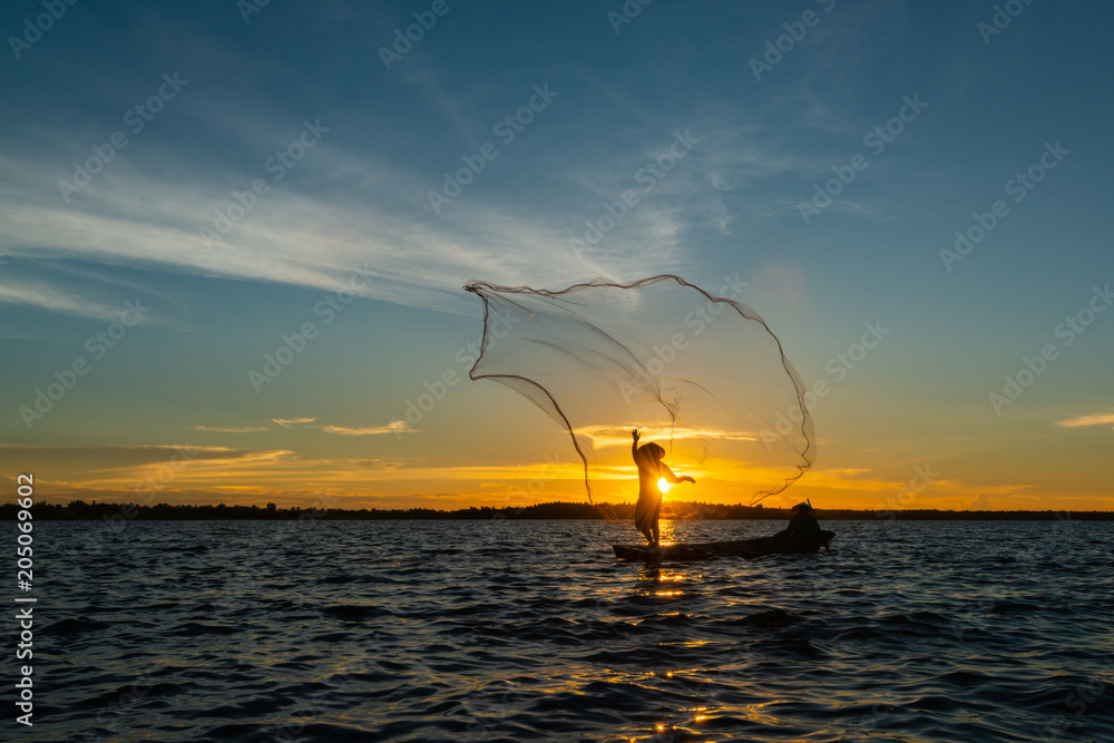 Un-identified silhouette fisher man on boat fishing by throwing fishing net #205069602