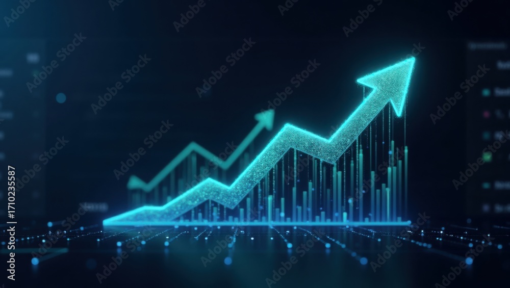 Un panel de análisis de startups proyecta audaces flechas de crecimiento del mercado, métricas de innovación que brillan intensamente, reflejando creatividad y un impulso imparable #1710235587
