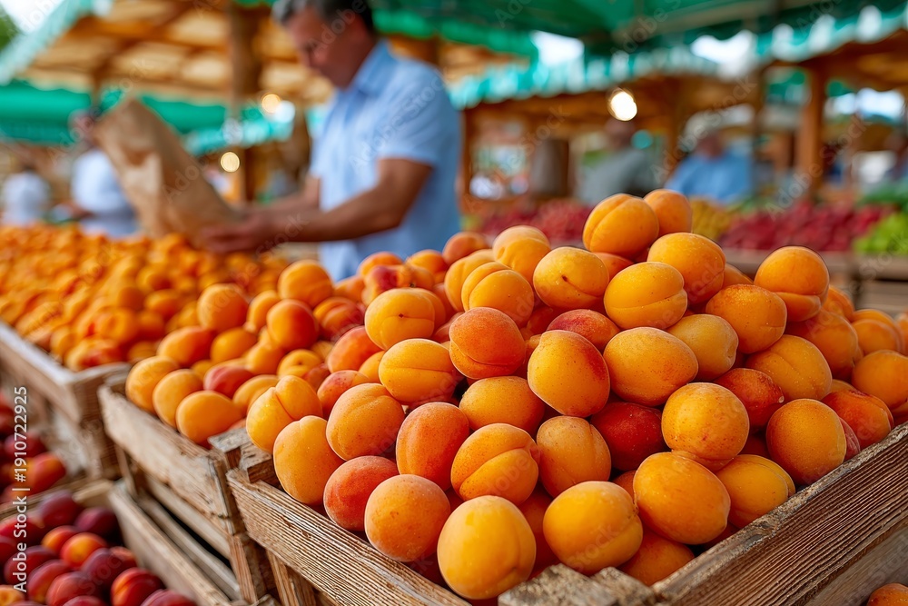 Un puesto lleno de albaricoques maduros se extiende sobre mesas de madera en un mercado exterior con un vendedor desenfocado al fondo. #1910722925