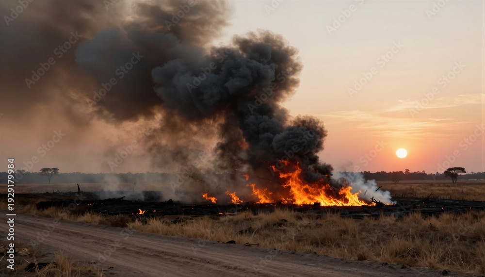 Un vasto incendio forestal al atardecer, con una silueta humana observando la devastación. #1929179984