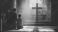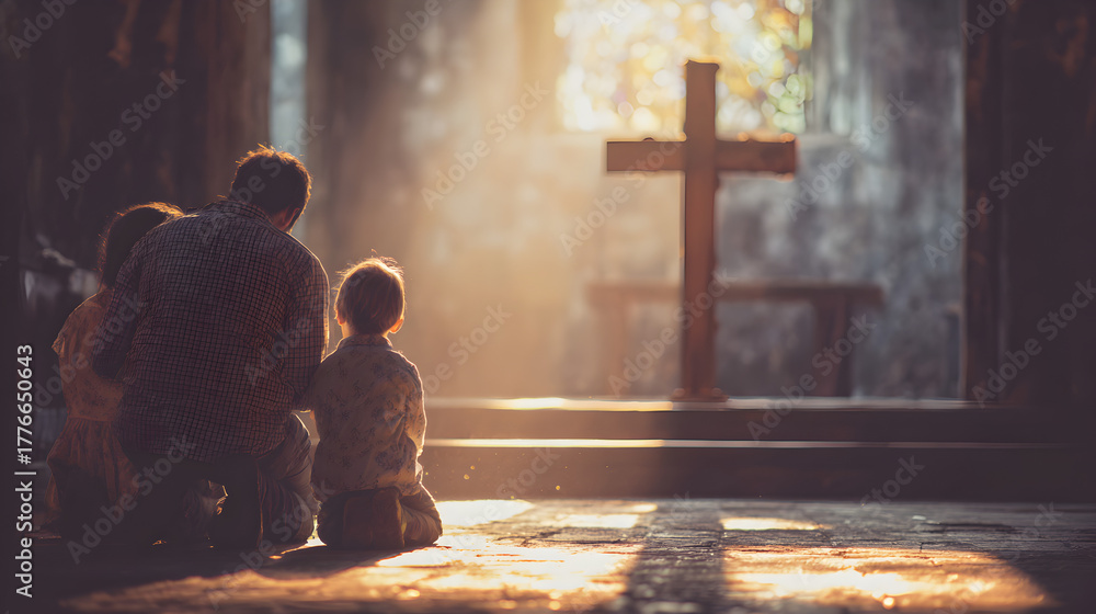 una familia unida hincados a los pies de la cruz dentro de una capilla con la luz del atardecer orando y rezando a Dios con fe y esperanza agradeciendo su bendicion #1776650643