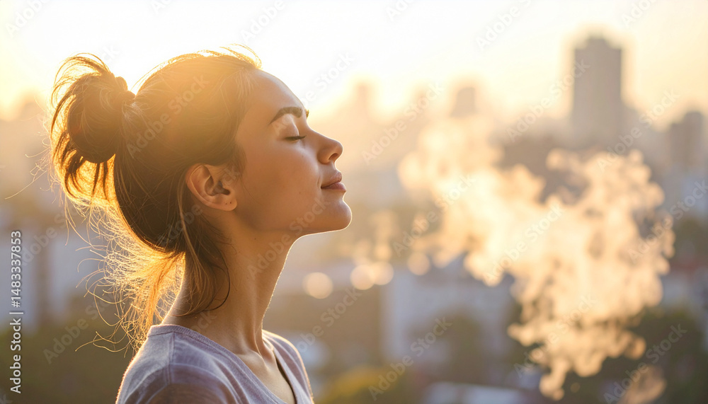 Una mujer con los ojos cerrados respirando aire puro relajada en un entorno de ciudad limpia y sin contaminación, una escena de calma, salud y bienestar #1483337853