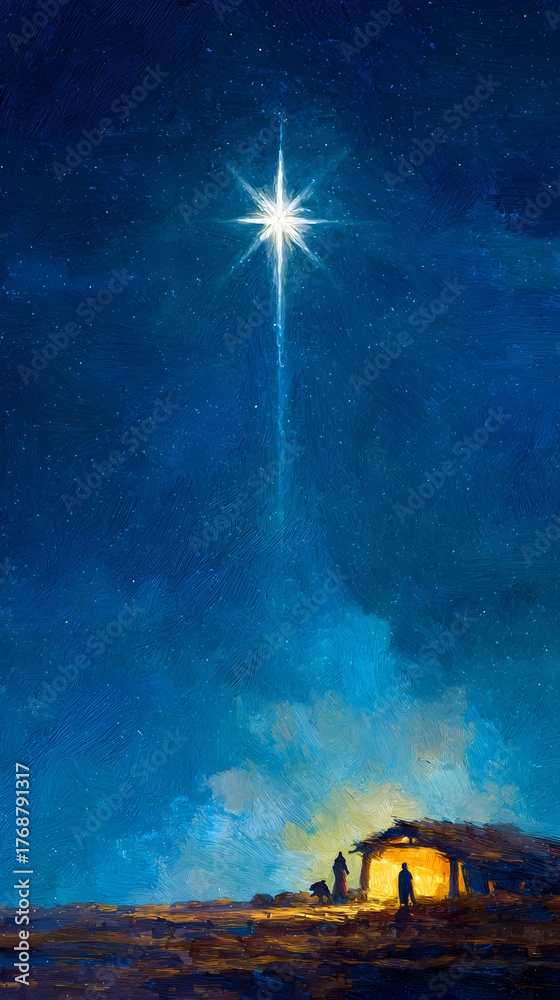 una pintura en acuarela de un nacimiento del niño Dios en un pecebre con la estrella de belen en diciembre celebracion espiritual catolica navideña #1768791317