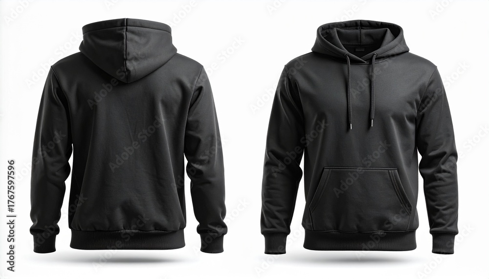 Una sudadera con capucha negra sencilla que se muestra desde las vistas frontal y posterior, aislada sobre un fondo blanco, ideal para exhibir el diseño de prendas y la maqueta de la marca. #1767597596