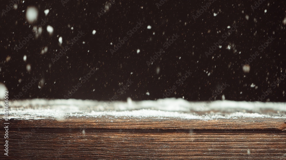 unanimity. Winter wooden surface with gentle snowfall, cold seasonal atmosphere. travel magazines, destination branding, designed for outdoor magazines and nature guides, inspires travel planning. #1851656552