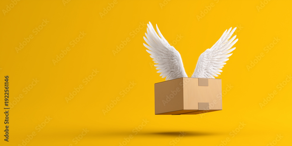 Unbranded cardboard shipping box with white dove wings suspended against a bright mustard yellow background symbolizing an ultra fast international delivery and modern ecommerce concept. #1922561146