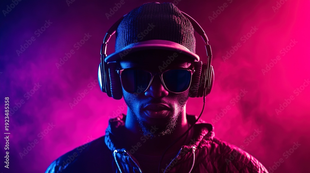 Under colorful lights, a focused DJ with sunglasses and headphones crafts powerful music vibes. The scene pulses with energy, drawing people into the rhythm as night unfolds #1923485358
