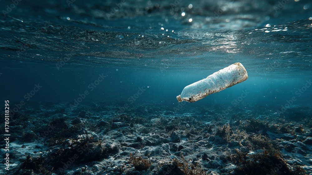 Underwater Scene of Plastic Bottle Floating Above Sea Floor in Clear Water Environment #1780118295