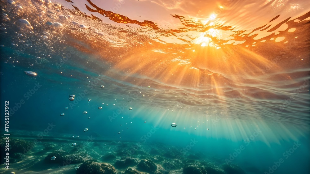 Underwater sunlight rays ocean view with bubbles and rocks scenic nature photography image stock photo #1765127912