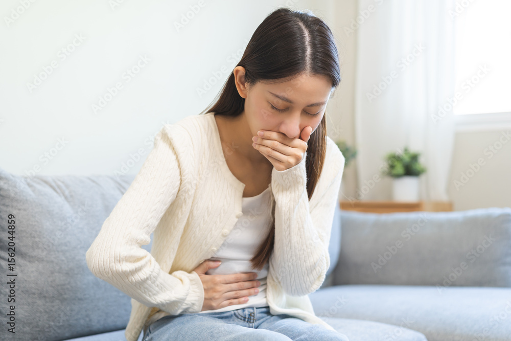 Unhappy pregnant asian young woman, pain girl suffering from nausea, having vomit feeling sick covering mouth, touching belly having problem throwing up from food poisoning, lady with morning sickness #1562044859