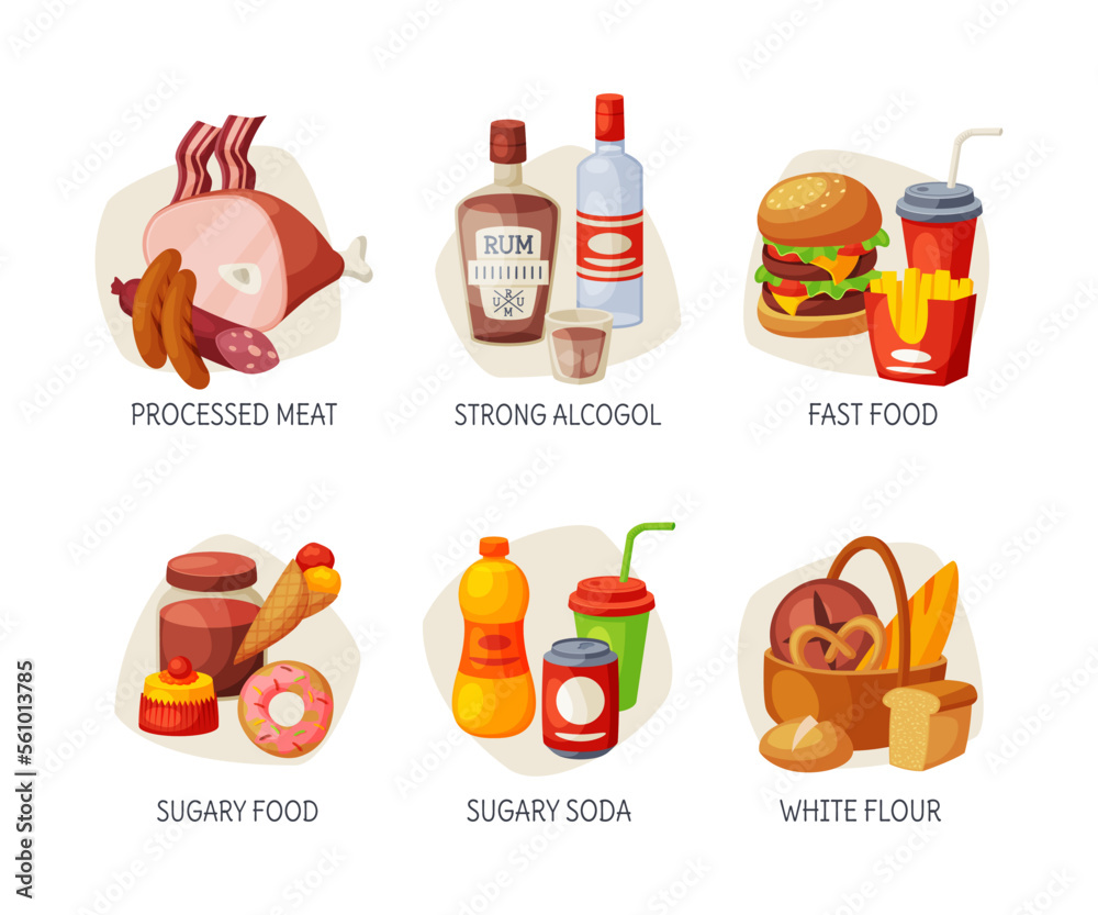 Unhealthy meal set. Processed meat, strong alcohol, fast food, sugary soda, white flour cartoon vector illustration #561013785