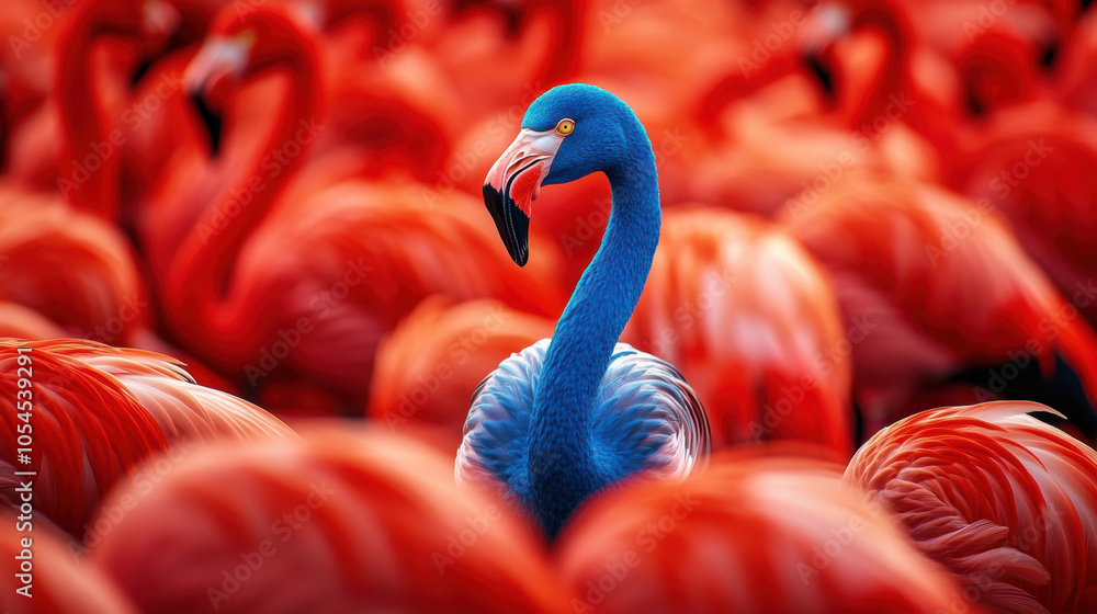 Unique Blue Flamingo Standing Out Among Red Flamingos. #1054539291