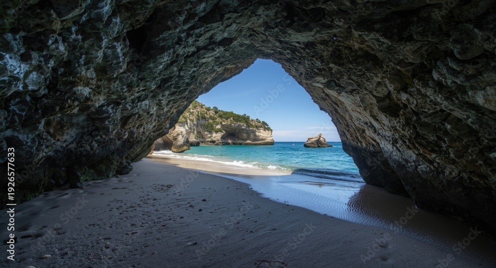 unique seaside perspective captured inside a natural stone cave #1926577633
