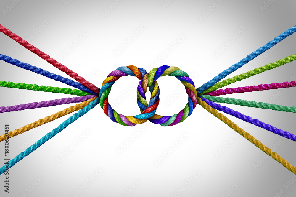 United Diverse Groups and team Unity Success Concept Connecting together two teams in perfect circles as a teamwork symbol or a business success metaphor for joining a partnership of diversity. #1800620451